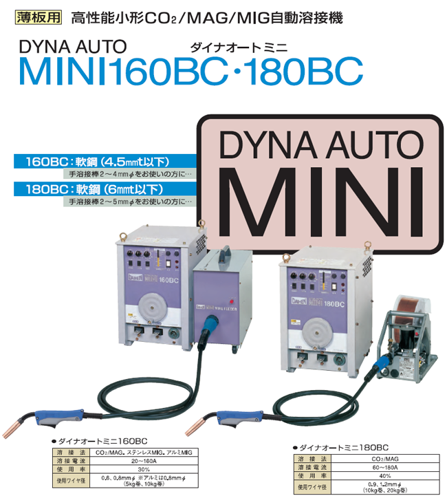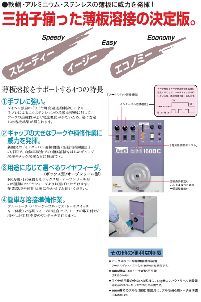 ■手溶接に比べて溶接コストが大幅節減できる高能率な小型CO2/MAG/MIG自動溶接機です ■軟鋼・アルミ・ステンレスなど材質で溶接モードが選択可能です(160BC) ■独自の「ワイヤ可変速送給制御」により手ブレに強く常に安定した溶接が可能です ■「インターバル溶接機能」でタック溶接やギャップの大きな補修溶接に威力を発揮します ■アークスポット溶接機能を標準装備してます