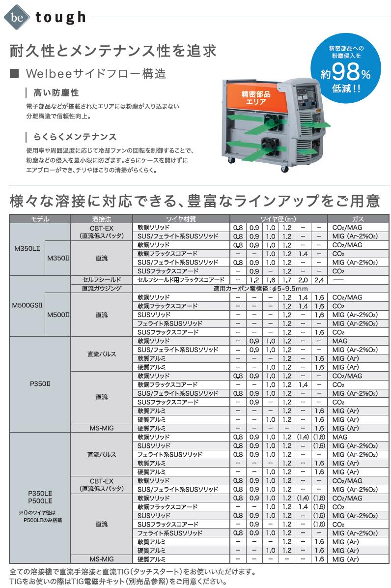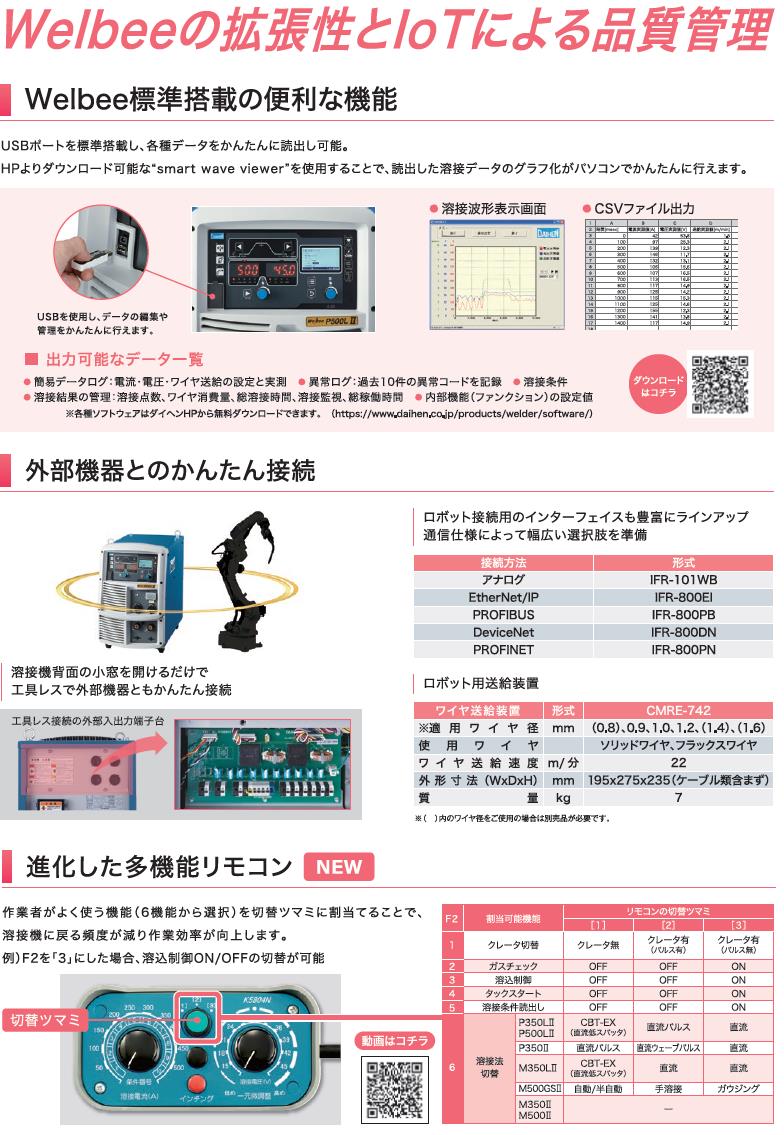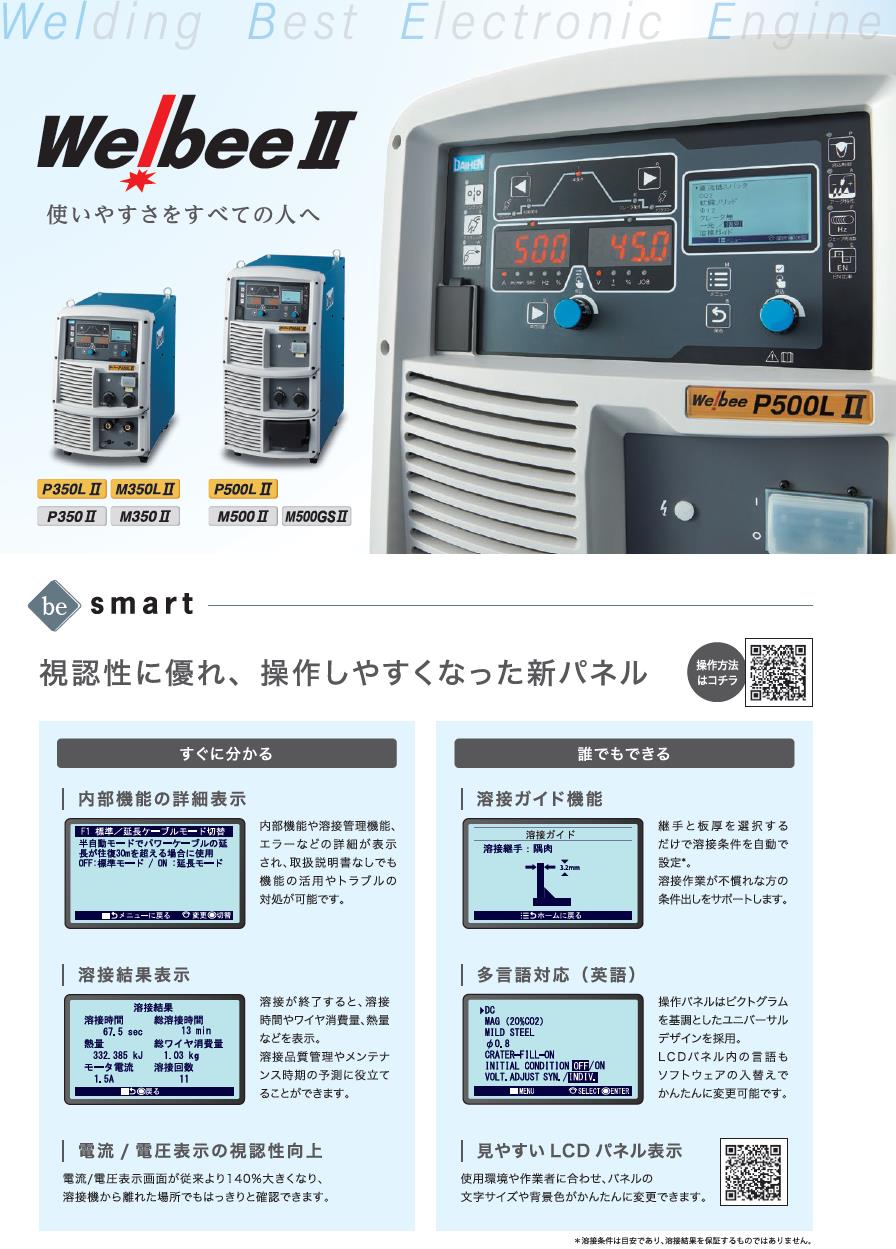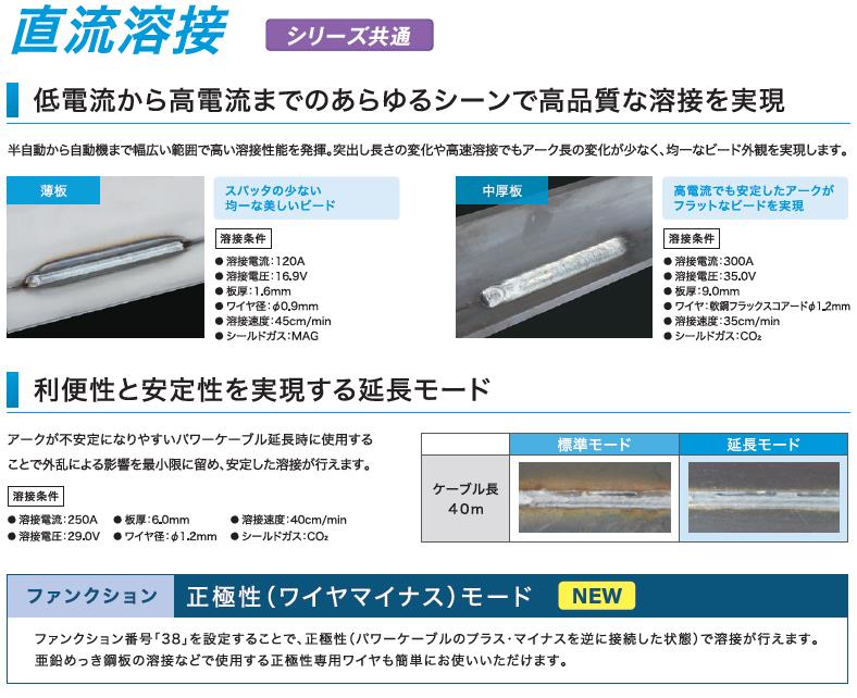 ●LCD搭載のシンプルで分かりやすい操作パネル 豊富な情報を表示でき、取説なしでファンクション・エラーの詳細が確認可能 溶接条件設定をアシストする「溶接ガイド」機能を搭載 ●低電流域から高電流域までスパッタの少ない溶接が可能 ●高速溶接でもスパッタの発生を抑え高品質な溶接を実現 ●直流モードが標準搭載 より柔軟な使い方が可能に