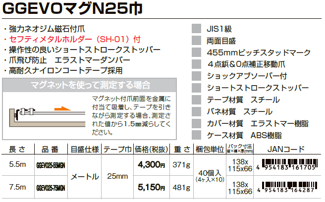 ・操作性を追及した新設計ショートストロークストッパー ・ショックに強い新設計エラストマダンパー ・絶妙なフィット感を実現した新型ケース ・JIS1級 ・両面目盛 ・強力マグネット付爪 ・セフティメタルホルダー付 ・455mmピッチスタッドマーク付 ・4点鋲 ・テープ材質:スチール(ナイロンコート) ・バネ材質:スチール ・ケース材質:ABS樹脂