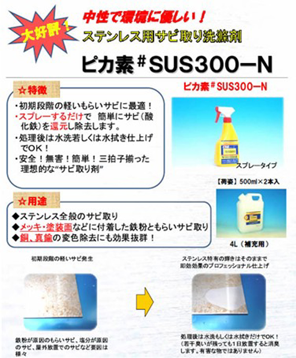 ⇒ステンレス用さび取り洗滌剤 ピカ素 SUS300-N 4リットル 【ケミカル山本】【送料無料】の表示価格は定価となります。お見積り、お問い合わせはこちら。